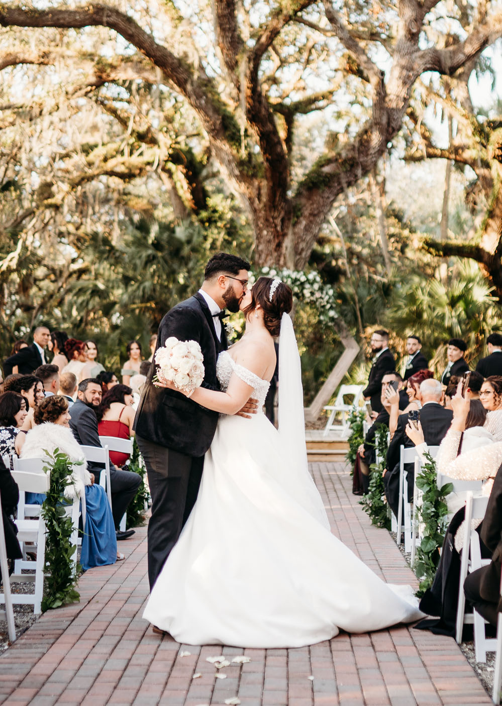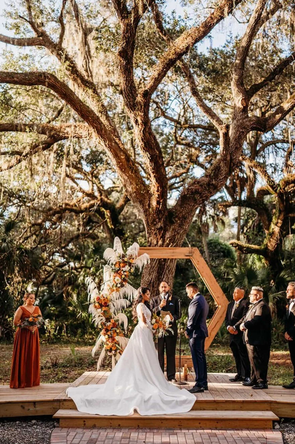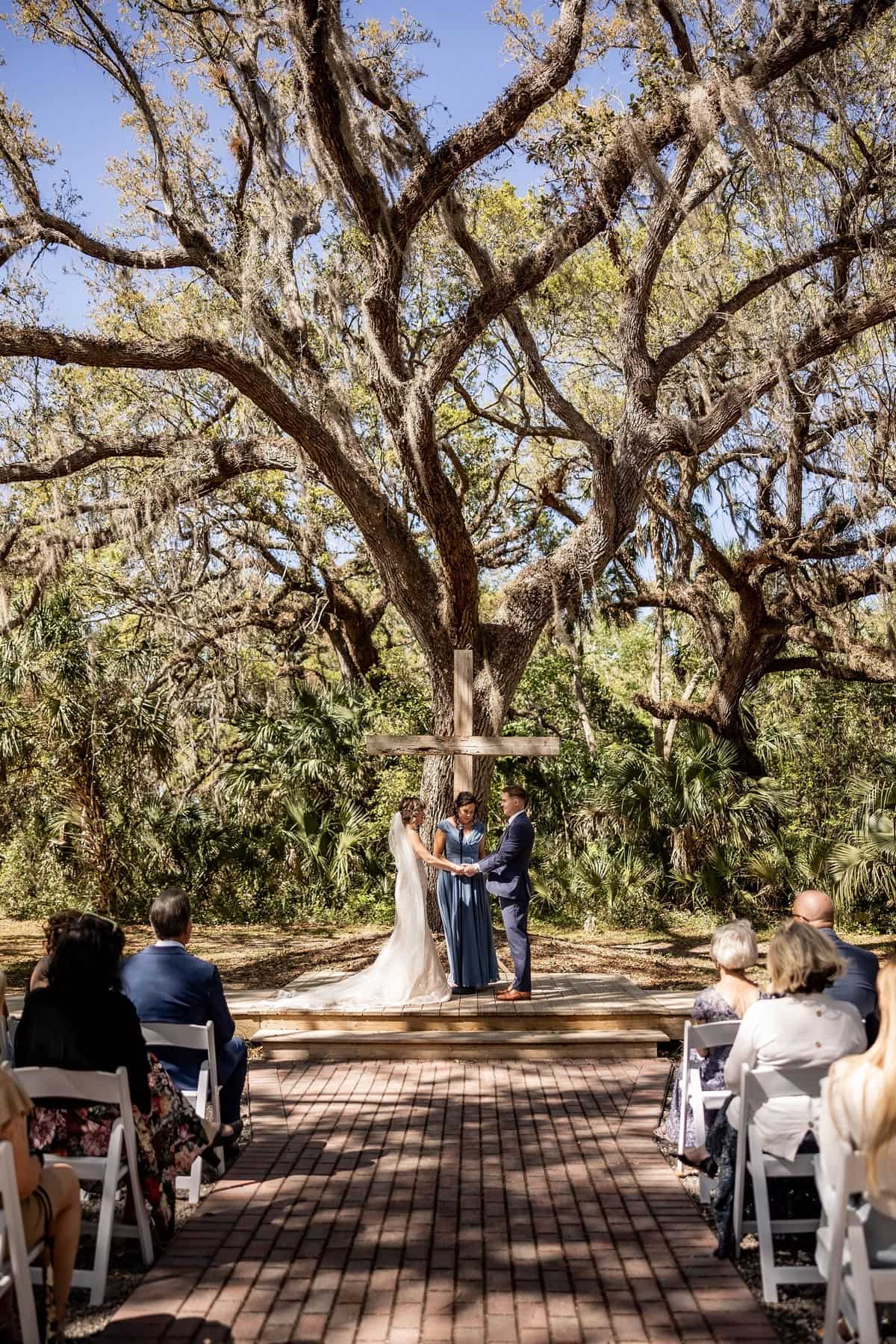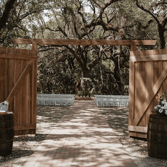The Ceremony Grove is an enchanting, magical wedding setting. Surrounded by giant Oak trees with Spanish moss, and wild oranges peaking through the woodland. The double entrance gates are closed once all guests are seated, in anticipation of the Bride’s grand appearance and walk down the aisle. The large purpose built altar, with a choice of feature wooden backdrop, creates the perfect framing in which vows are exchanged. This beautiful outdoor space also features a modern restroom facility so your guests have no excuse to peek inside the main venue until the reception!