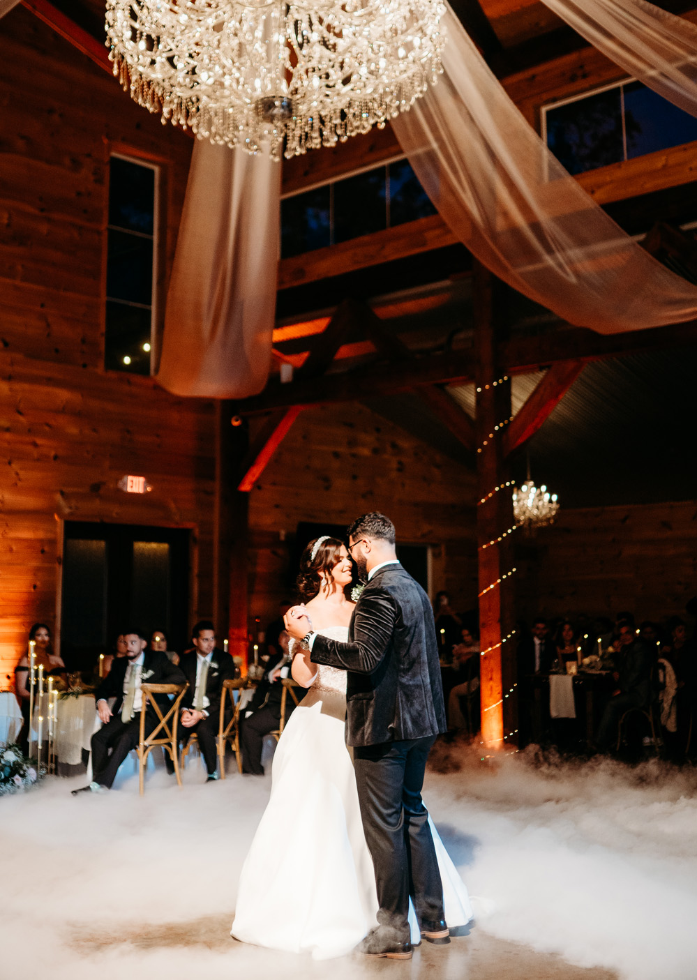 As you enter The Grand Hall of the barn, you will notice the soaring 45-foot ceiling and a floor-to-ceiling stone fireplace with a beautiful accent mantle, milled from sunken cypress which is over 2,500 years old. A dazzling central 8-foot crystal chandelier, and surrounding smaller chandeliers, add beauty and elegance to the rustic feel of the venue. A grand timber staircase winds up to a spacious balcony overlooking the spotlit dancefloor. From here, the newly married couple will make their first grand entrance together! The Grand Hall can comfortably seat 250 guests.